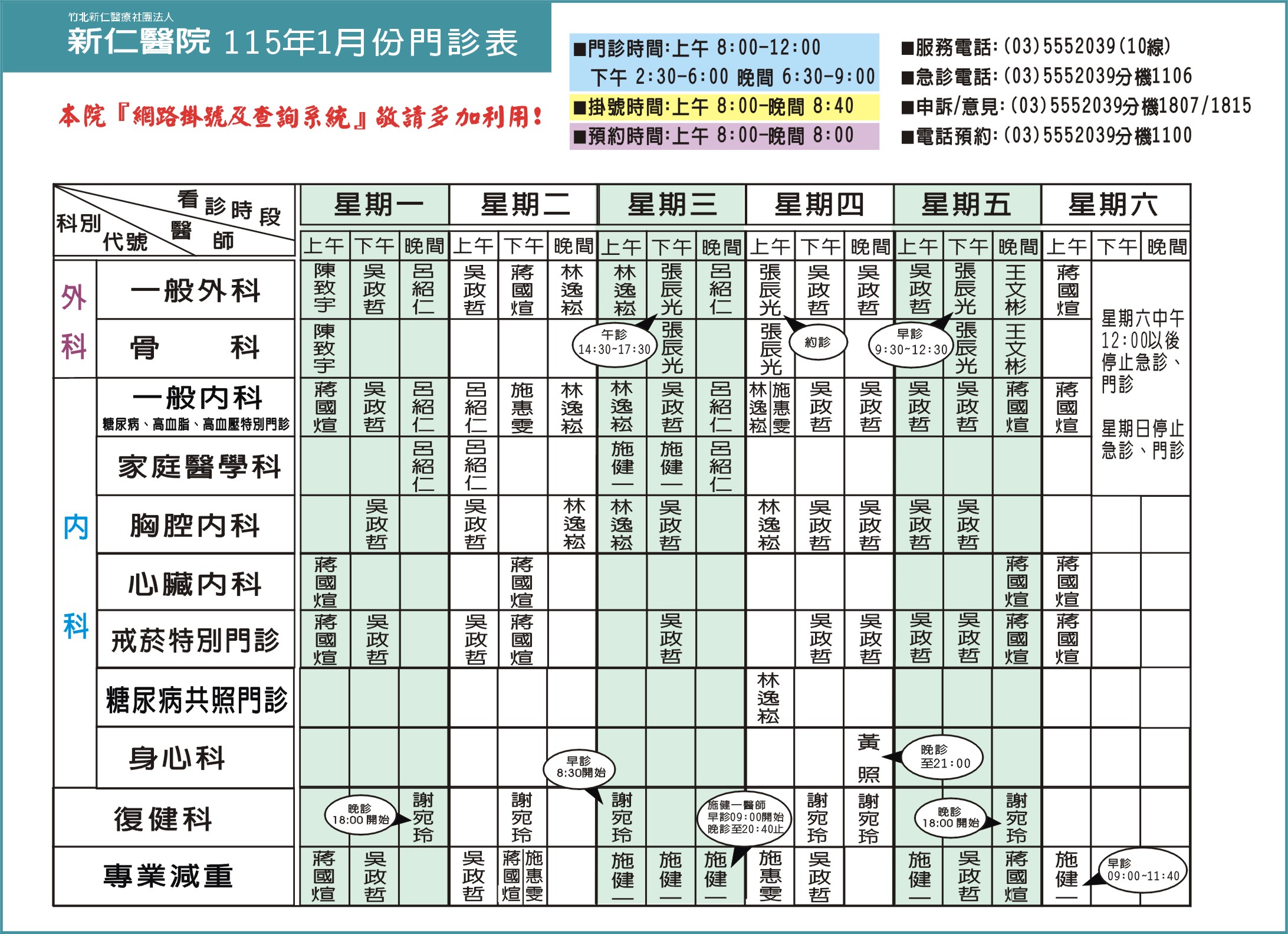 115年1月份門診時間表,歡迎多加利用