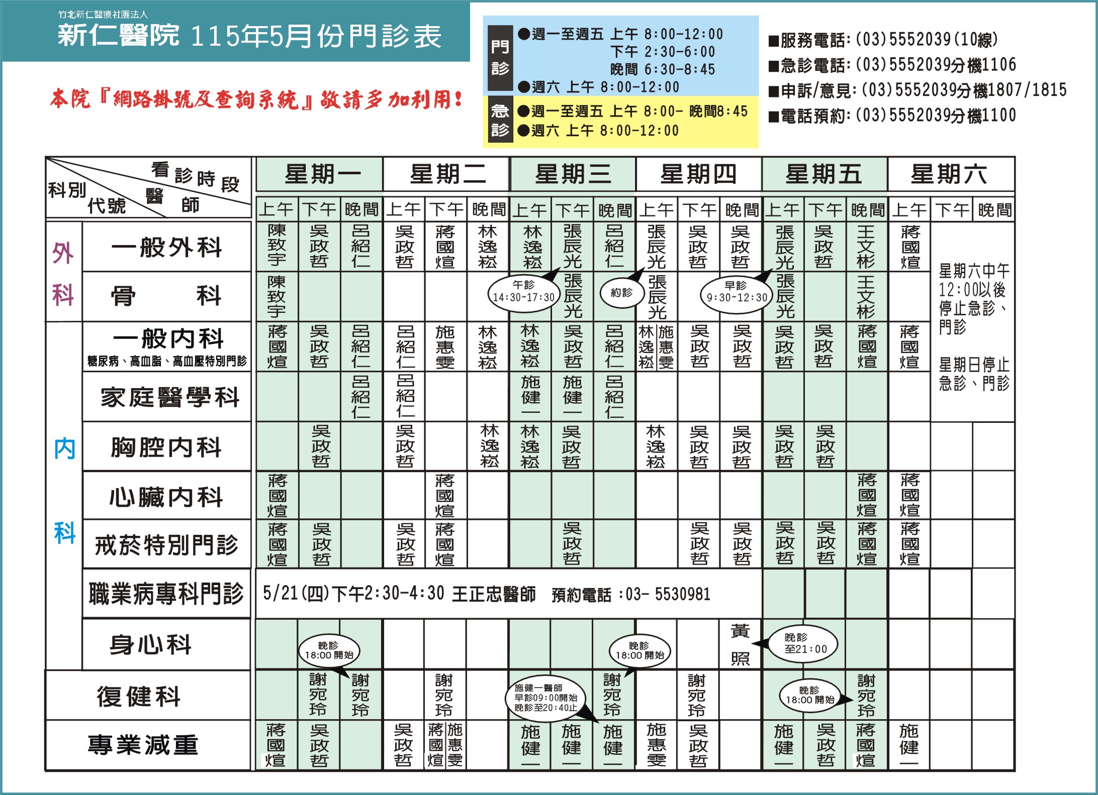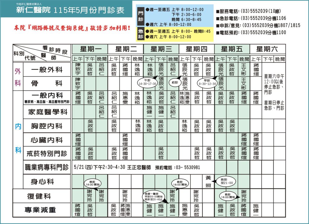 115年5月份門診時間表,歡迎多加利用